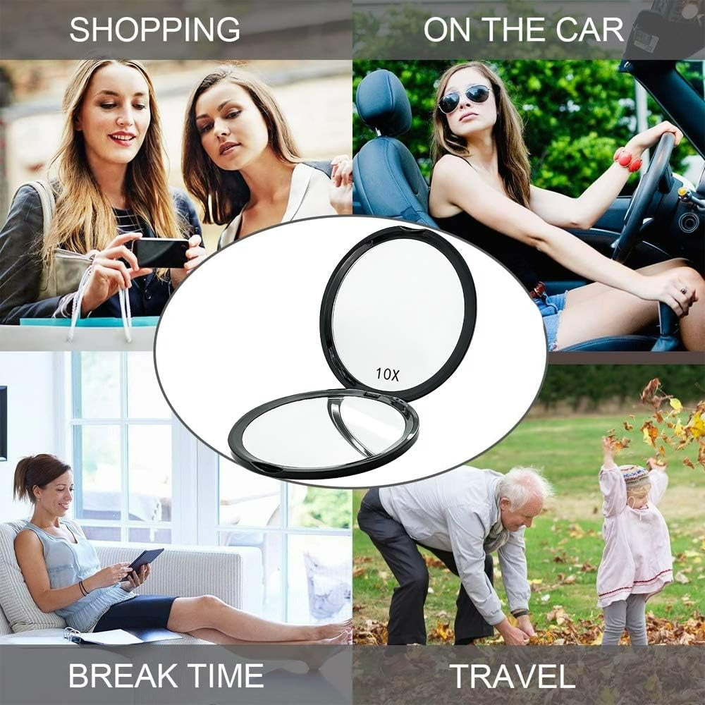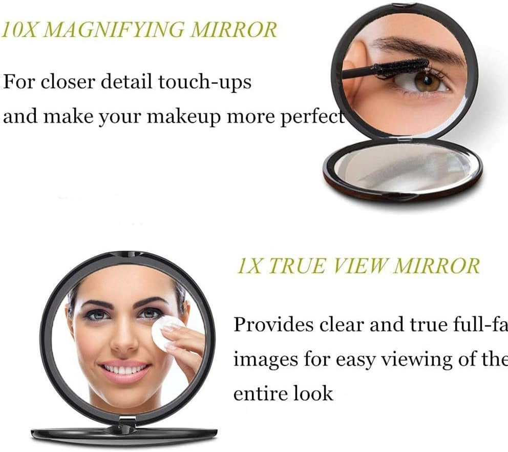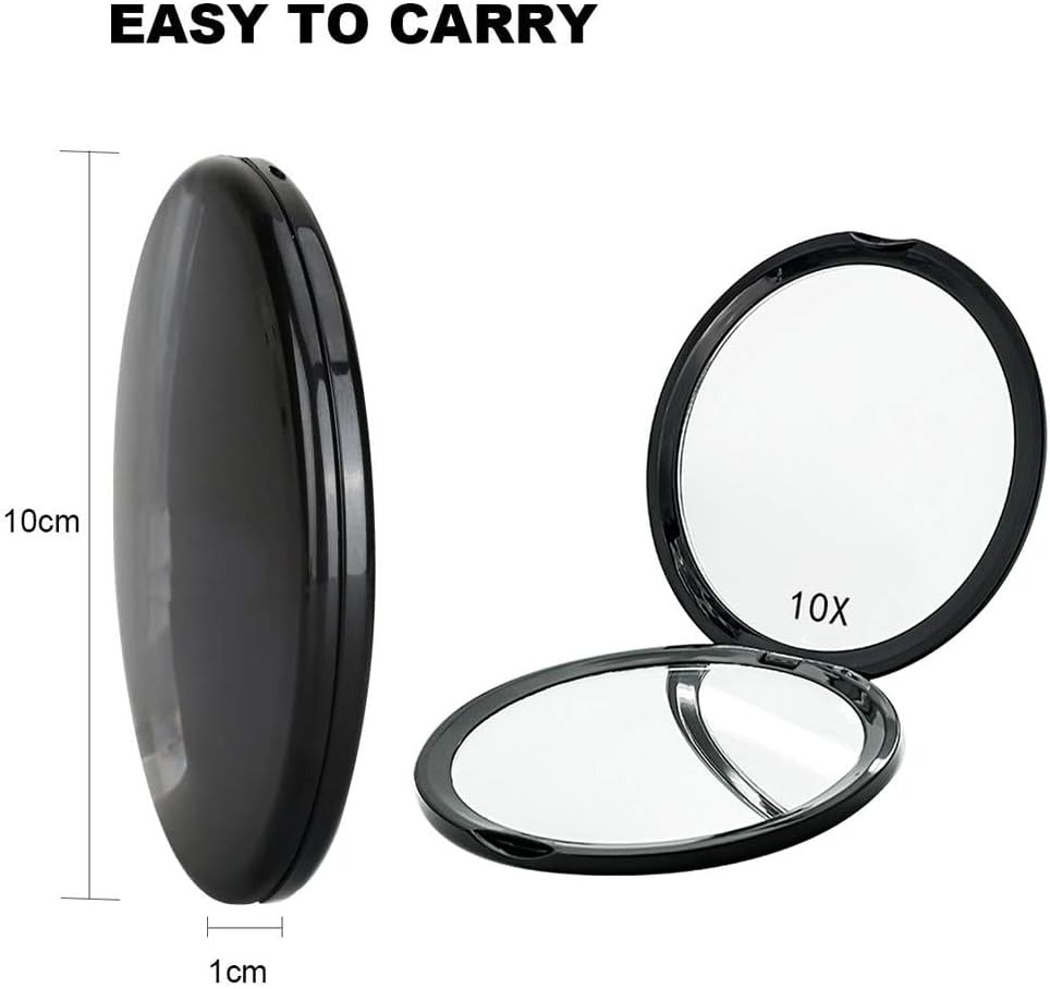 This compact cosmetic mirror is the perfect travel companion, easily fitting in your purse while offering a wider field of view than most compact mirrors. With 10x magnification for precise makeup application or eyebrow tweezing, it ensures accuracy and detail on the go. Measuring approximately 100 mm in diameter and less than 15 mm thick, it combines portability with functionality. This elegant and professional mirror, made from a sleek ABS body and high-quality glass, allows for effortless makeup touch-ups anytime, anywhere.